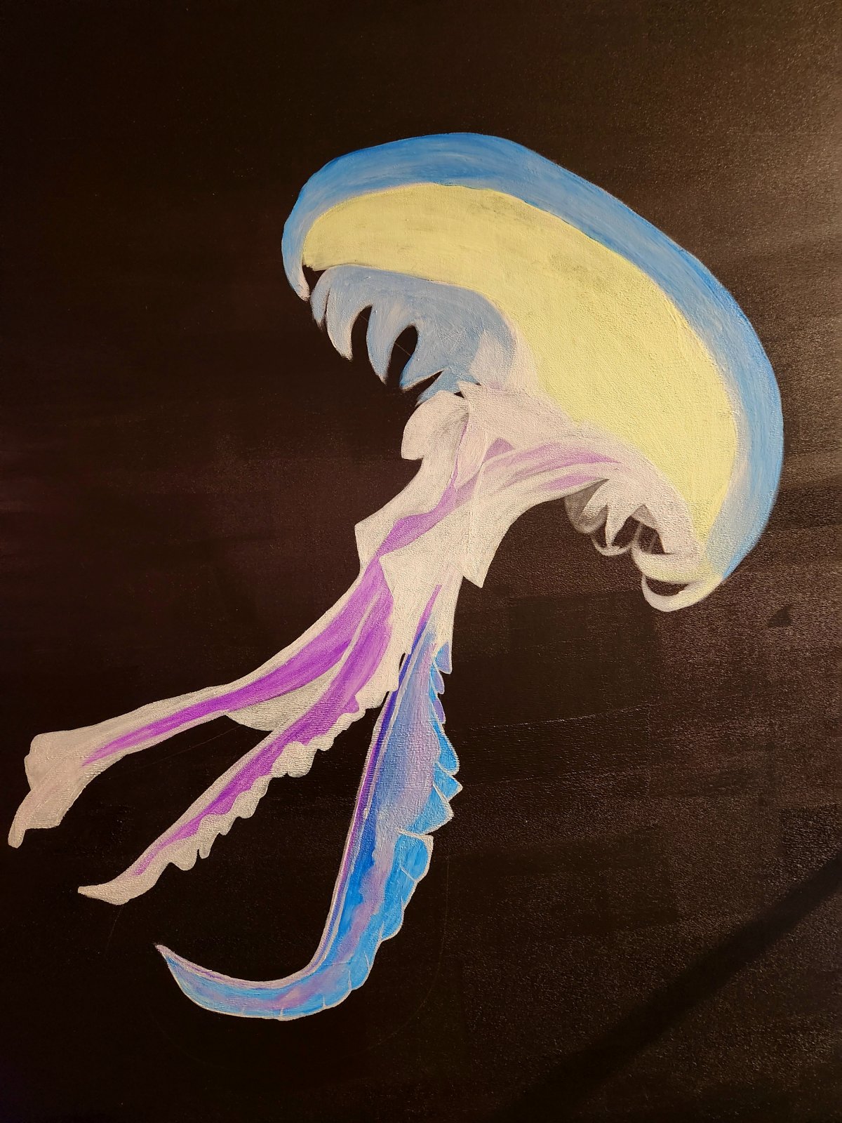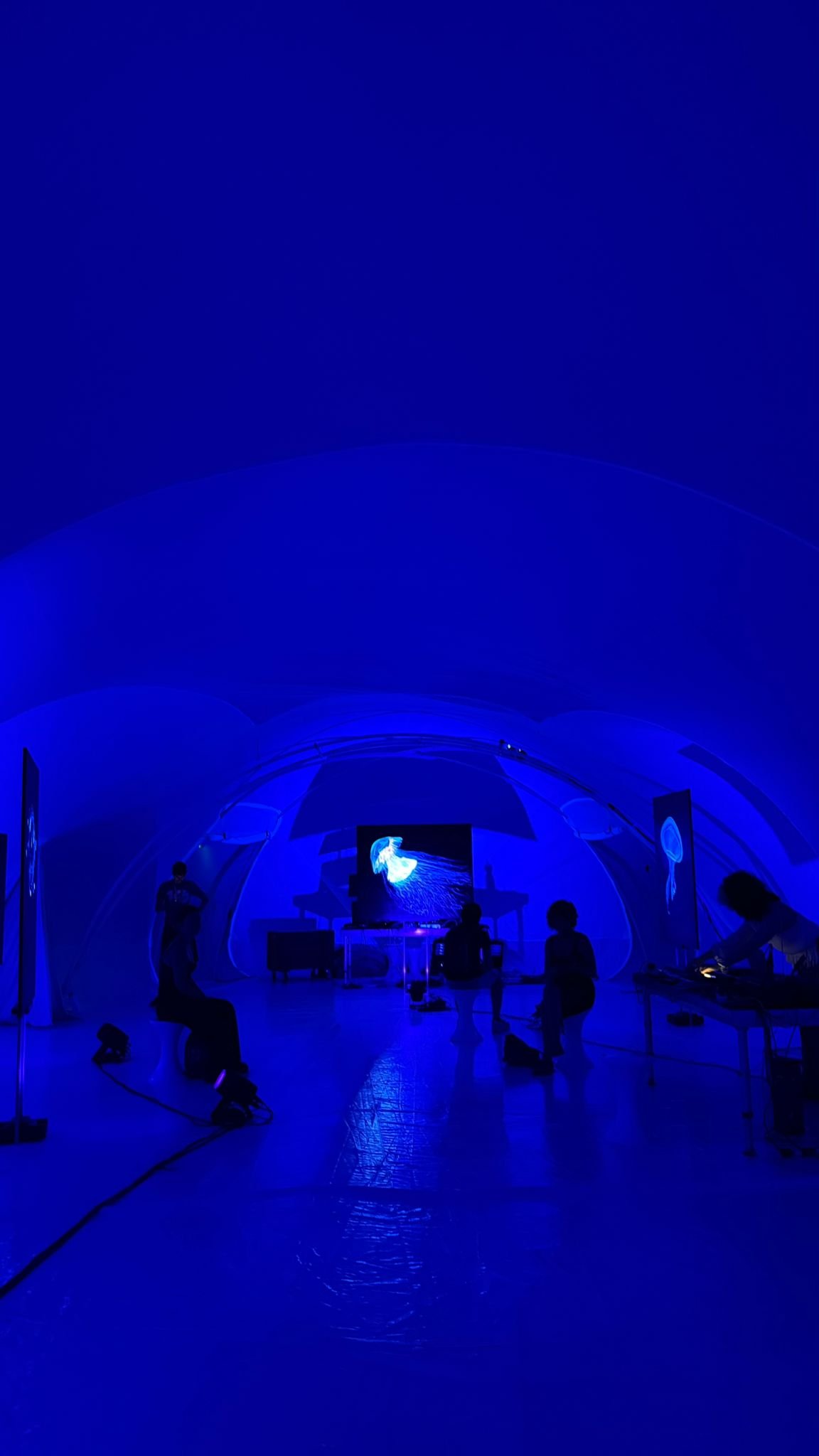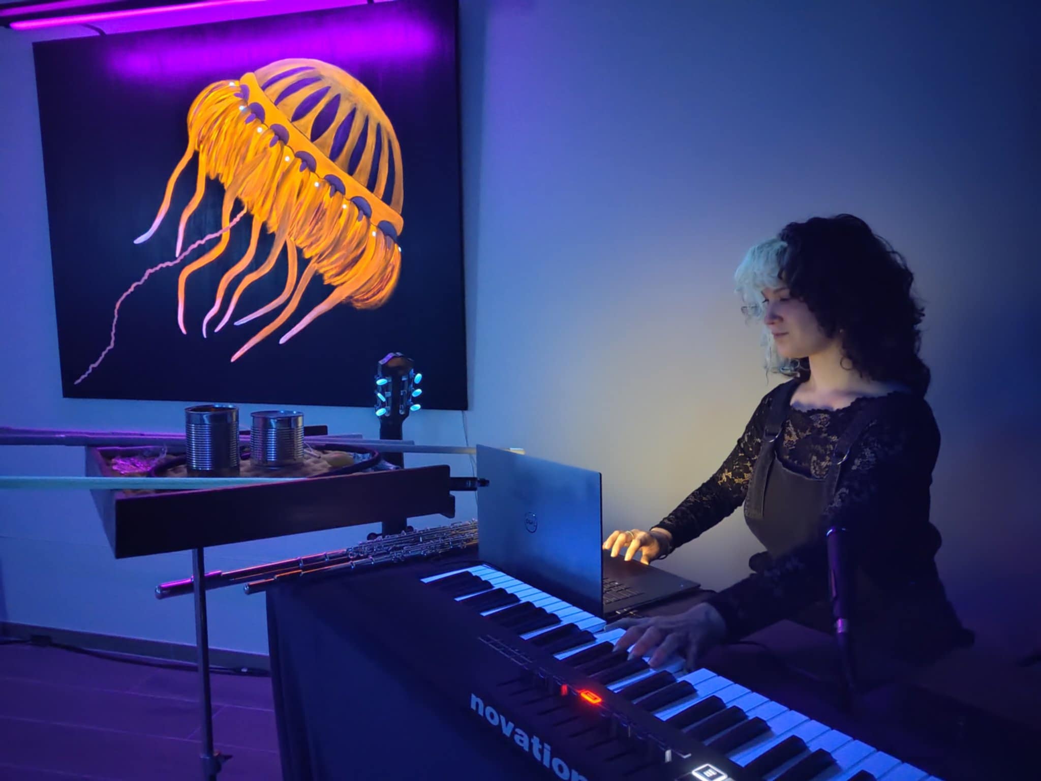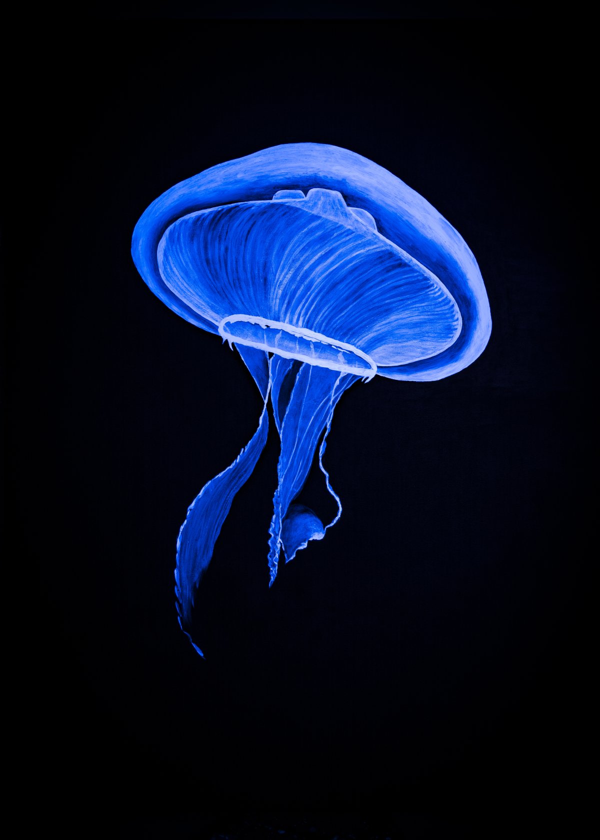 Laura a imaginé une installation sonore plongée dans l’obscurité, mêlant peinture fluorescente et composition ambient et électronique, pour nous faire (re)découvrir la beauté énigmatique des méduses et nous immerger au cœur des abysses. Des performances sonores permettent à l’artiste d’explorer toute une gamme de sonorités qui viennent s’imbriquer à celles de la composition. Pour cela, Laura utilise des instruments qu’elle détourne de leurs usages habituels, dont certains qu’elle a elle-même fabriqués. Elle exploite également les sons de ce qu’elle aime appeler “objets sonores”, et retravaille l’ensemble de ces textures sonores en direct avec un logiciel pour y ajouter des effets.