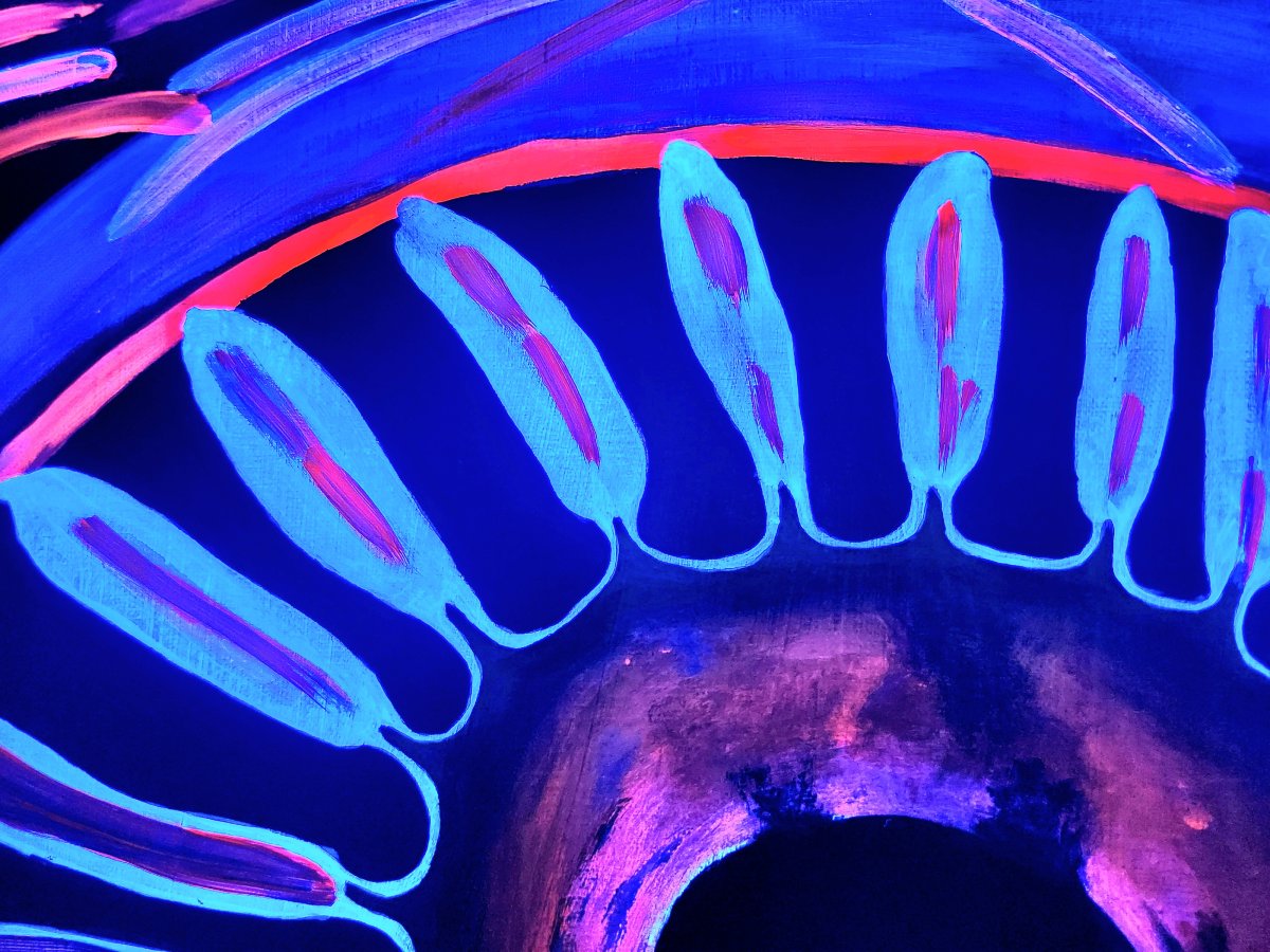 8 toiles (150 x 120 cm), technique mixte (peinture acrylique, peinture acrylique fluorescente), 8 spots lumière noire