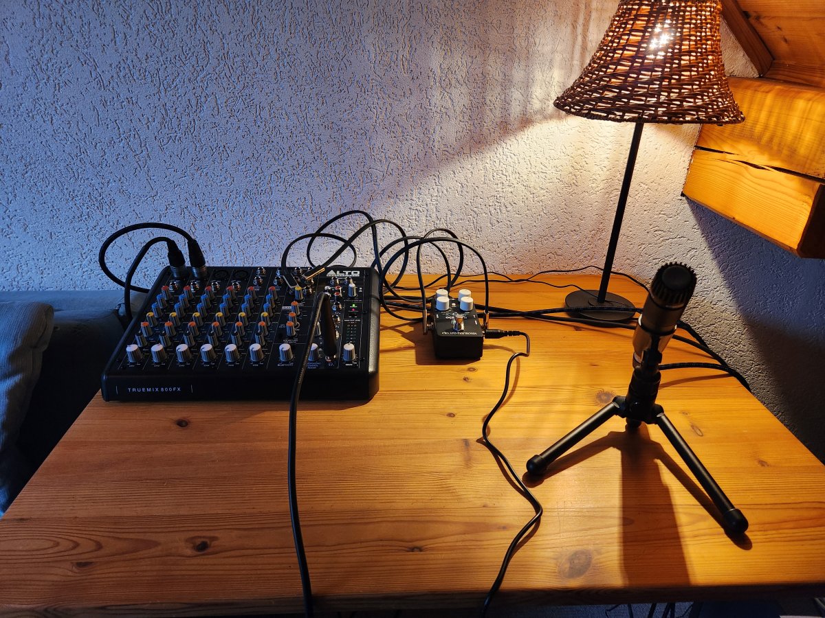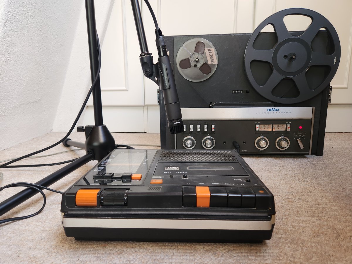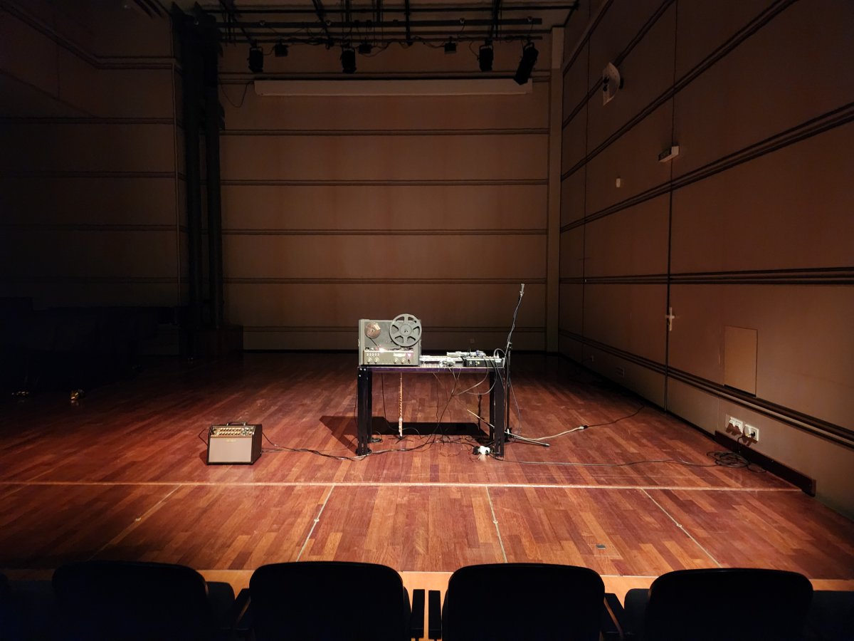 Installation sonore avec Revox A77, flûte, flûte basse, pédale d'effet, table de mixage, 2 micros