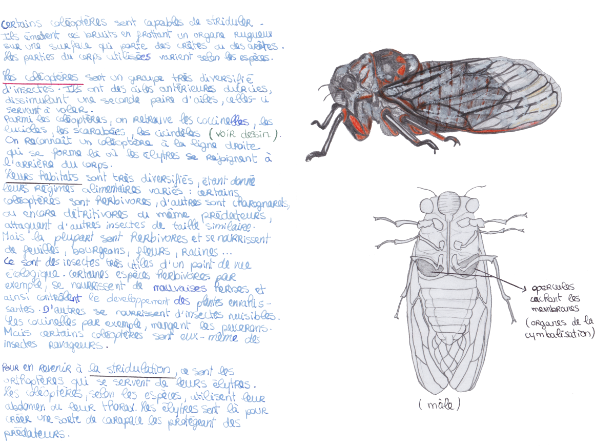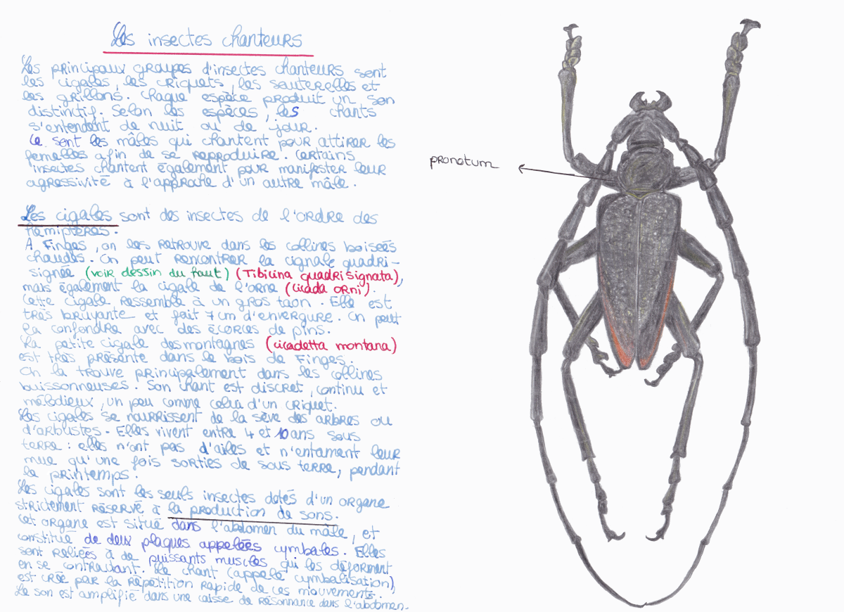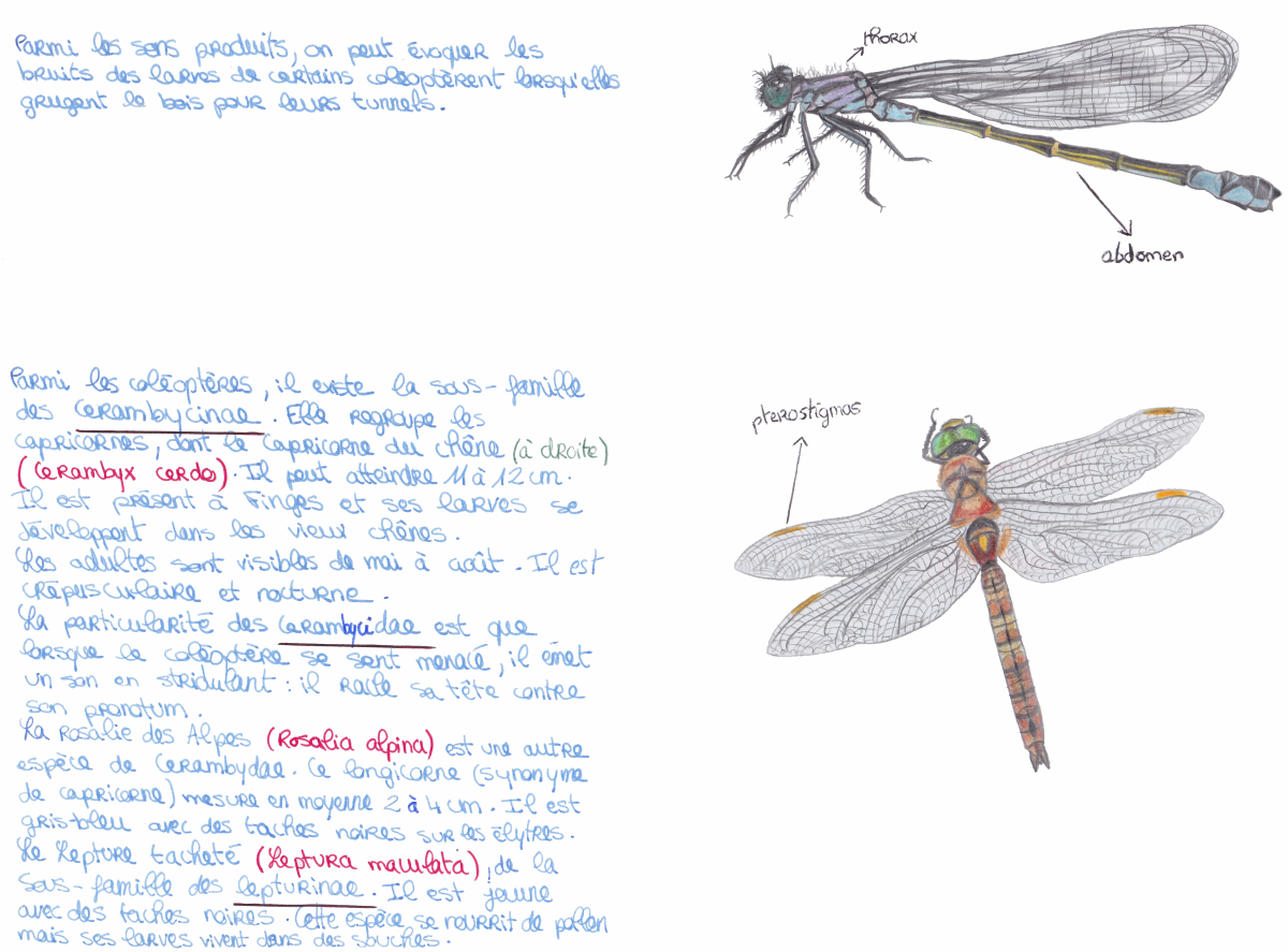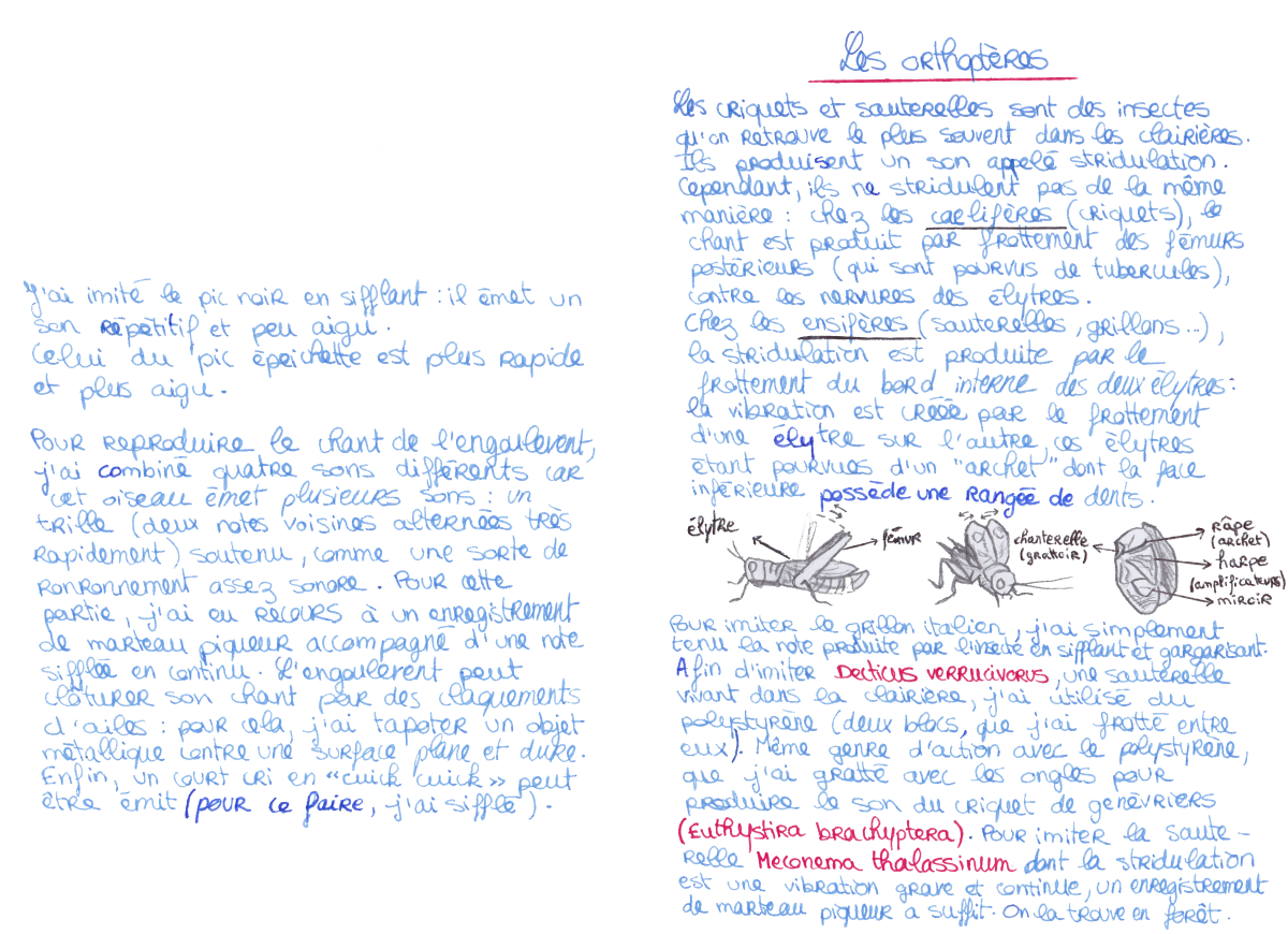 Cette pièce sur le thème des insectes repose sur la place de la collaboration entre interprète et entité non-humaine au sein d’une composition musicale et artistique. Cette problématique englobe également la question du phénomène de voix électroniques – communication avec l’au-delà via un appareil électronique –, et repousse ainsi les frontières de la création musicale en proposant une approche multidimensionnelle. Cette question me permet de développer mes recherches autour de l’exploitation simultanée du magnétophone et de l’interprétation Live, ou sur l’idée de faire dialoguer des éléments en direct avec des éléments préenregistrés. Avec ce projet, j’ai voulu imaginer une collaboration entre une entité vivant au travers d’une bande magnétique, et une entité bien réelle et présente sur scène, que j’incarne avec ma flûte traversière. Dans la bande magnétique, des insectes ainsi que quelques mélodies à la flûte sont comme enfermés dans le magnétophone, devenant alors une présence, une sorte de mirage. Sur scène, des flûtes, dont le timbre est modifié à l’aide d’une pédale d’effet, cohabitent avec le magnétophone pour ne devenir qu’une seule et même voix. Un processus de dégradation a été élaboré en amont sur la bande magnétique, afin d’atteindre un son encore plus organique. Aucune des deux parties ne représente une forme d’accompagnement : le but est de les placer au même niveau et de les faire se rencontrer.