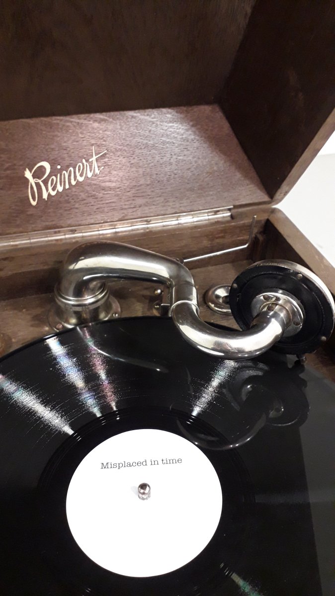 Installation avec gramophone, carton et vinyle